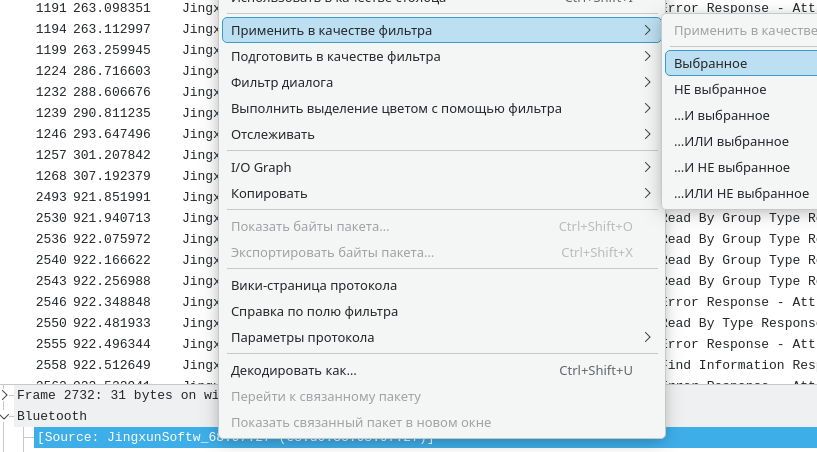В результате вверху окна прописывается фильтр вида _ws.col.def_src == "JingxunSoftw_xx:xx:xx (UT60BT)", но лучше использовать не это поле, а развернуть заголовки пакета и