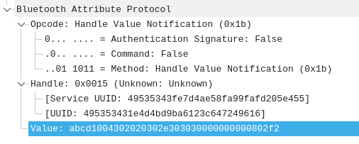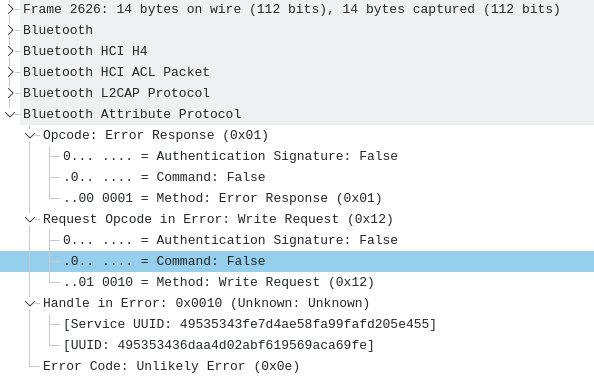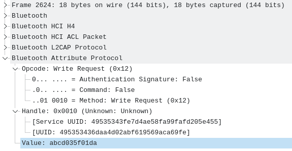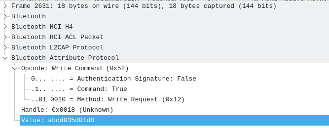 Далее от телефона идет команда на запись (без подтверждения). Wireshark не отображает UUID, в который идет запись, но это тот же идентификатор, что и в неудачной попытке выше. Только в этот раз магическая константа уже другая: abcd035d01d8.