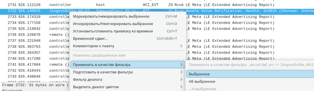В первую очередь надо оставить только пакеты между телефоном и мультиметром. Это сделать достаточно легко. Находим любой пакет с мультиметром, жмем правой кнопкой по полю, содержащему адрес устройства и выбираем его в качестве фильтра «Выбранное».