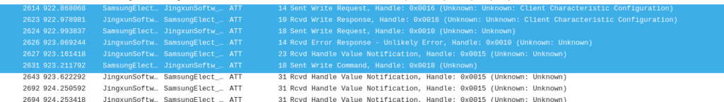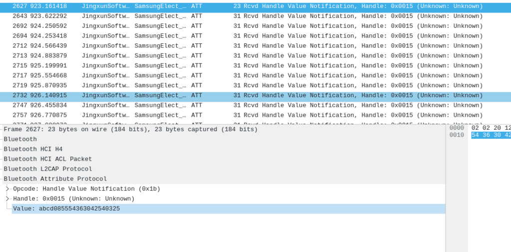 Что искать в дампе? Раз чтение уже было опробовано на этапе nRF Connect и не дало никаких результатов, то приложение, наверное, прописывает что-то для начала работы. Следующее, что требуется посмотреть внимательно — пакеты типа NOTIFY. Это сообщения от устройства об изменении значения какого-то параметра. Обычно именно таким способом передают данные в BLE.