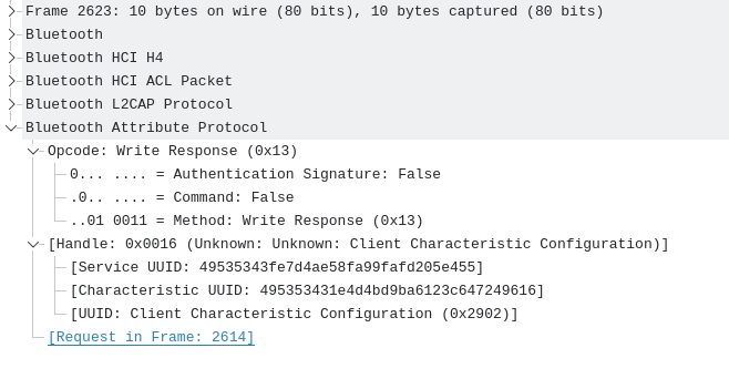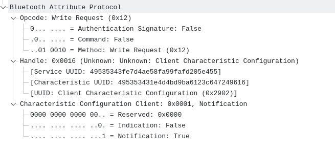 Вот интересующие нас пакеты. Как раз прямо перед началом потока. В первом пакете от телефона к мультиметру идет команда на запись, где включается подписка на изменения для указанного выше UUID.